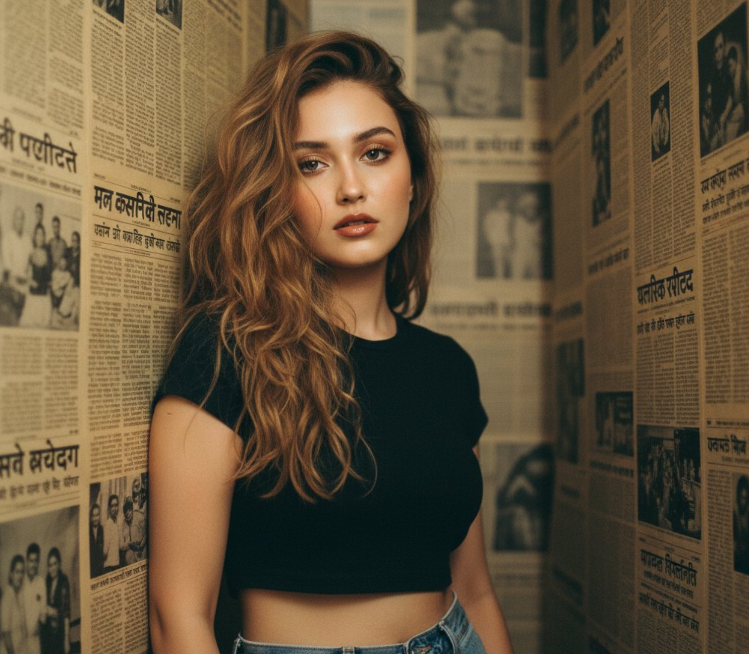 Photorealistic Indian retro portrait with authentic 1990s film aesthetic. Use image [0] as face reference. Half-body. Subject leaning against a wall covered in old, yellowed regional newspapers, gaze soft and melancholic. Wearing a black crop top and high-waisted jeans in casual 1990s street style. Hair messy, strands falling across face. Makeup with glossy lips and dewy skin. Narrow Indian room with walls plastered in aged local newspapers.